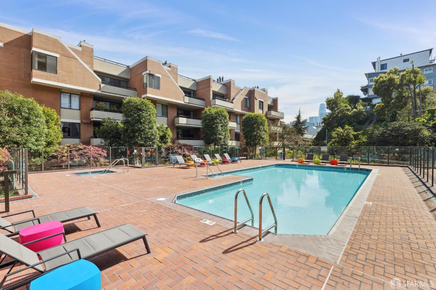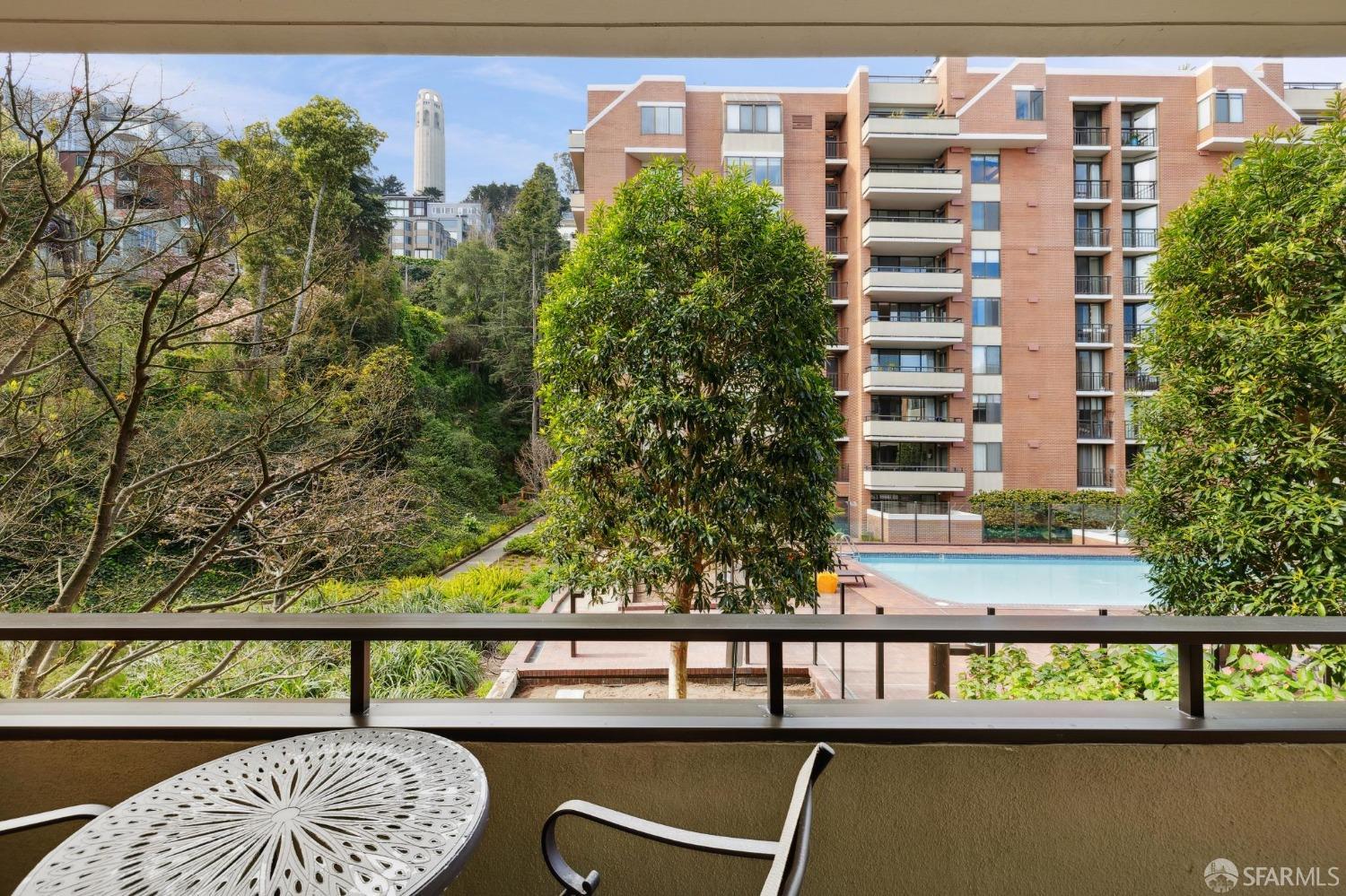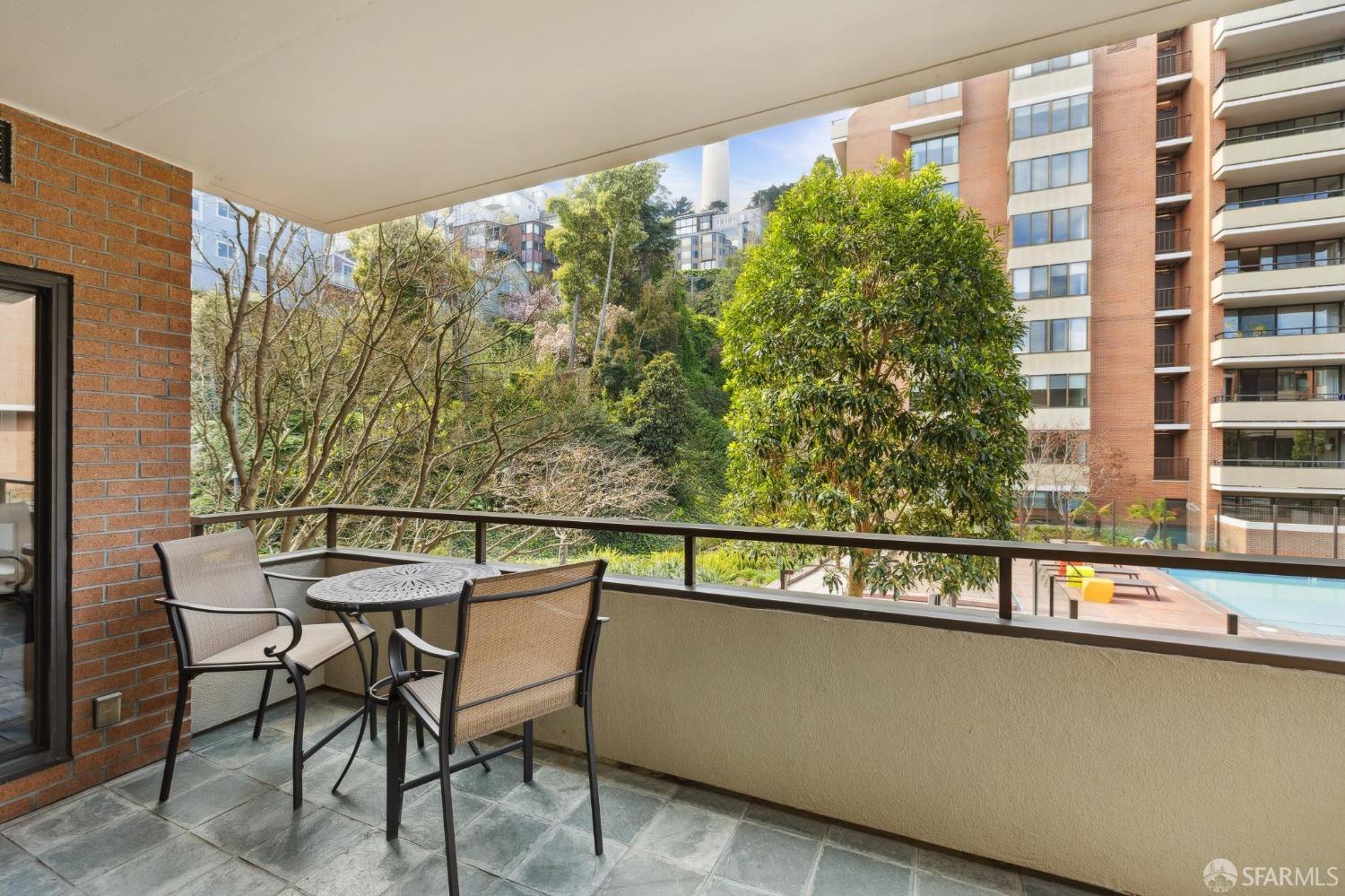 Stunningly remodeled residence designed for those who seek luxury, privacy, and convenience in a unique urban setting. This sophisticated pool-facing property features a large open living space. Enjoy the expansive deck, beautiful views of Coit Tower, a wood-burning fireplace in the living room, high ceilings, and gorgeous hardwood floors. The modern kitchen has been opened to the living area and includes excellent storage along with a washer/dryer closet. The split bathroom features a separate double sink and vanity area. The spacious bedroom suite overlooks beautiful trees, gardens, and Coit Tower, and it includes a huge walk-in closet. An additional storage area is conveniently located just outside the front door. Amenities include a 24-hour doorman, pool, spa, landscaped gardens, conference room, clubroom, electric car charging station, bike storage, common area roof decks, and a car wash area. The sought-after North Waterfront is nestled in a sunbelt below Telegraph Hill near the bay.