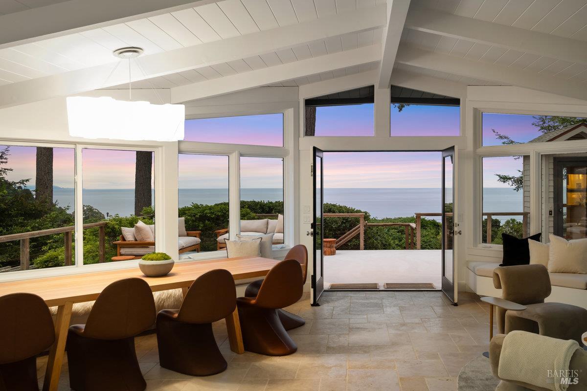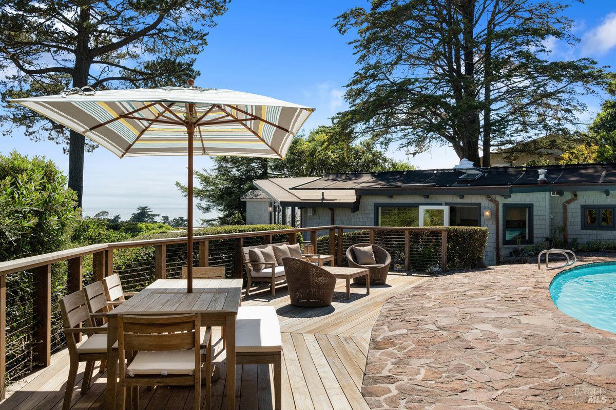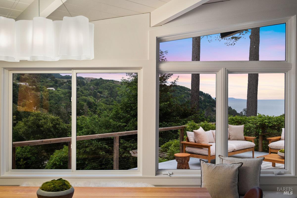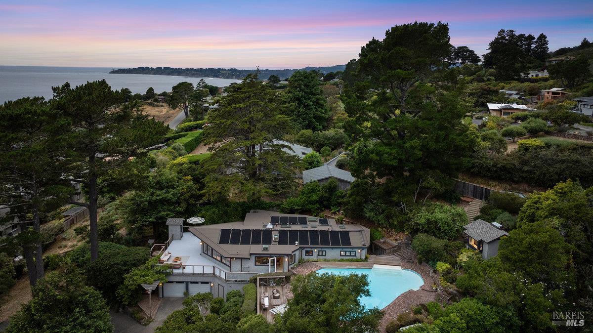 Wake to Ocean Whispers, Sleep Under Starlit Skies. Imagine morning coffee on sun-warmed redwood decks as Pacific waves shimmer beyond walls of glass. This Highlands sanctuary above Stinson Beach transforms everyday moments into pure magic. Sessions in the sauna that melt stress away, poolside dinners where laughter echoes under towering pines, and stargazing from rejuvenating hot tubs. The detached cabin offers endless possibilities: an art studio, office sanctuary, or creative retreat, while you effortlessly host in the gourmet kitchen's Viking range embrace. Three bedrooms become personal havens, each with ocean or mountain views that shift like living paintings throughout the day. Just a 10-minute walk to the beach for sand between your toes, yet completely private behind gates where fruit trees perfume the air and redwoods whisper ancient secrets. The elevator-accessible in-law suite means multi-generational memories, while renovated decks stretch your living space into nature's cathedral. This isn't just a home, it's where your soul exhales, where every sunset becomes a celebration, and where the rhythm of waves becomes your daily soundtrack.