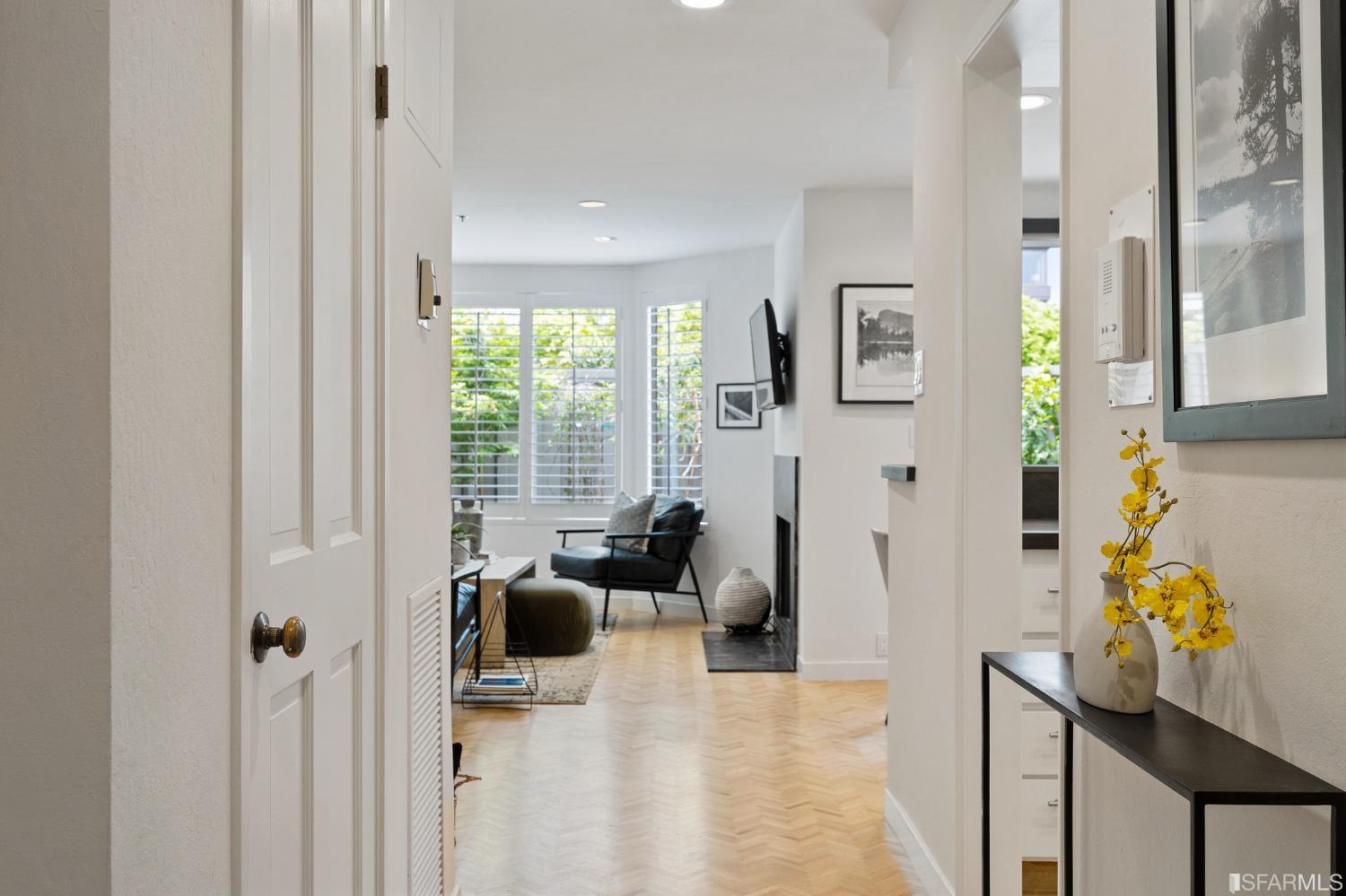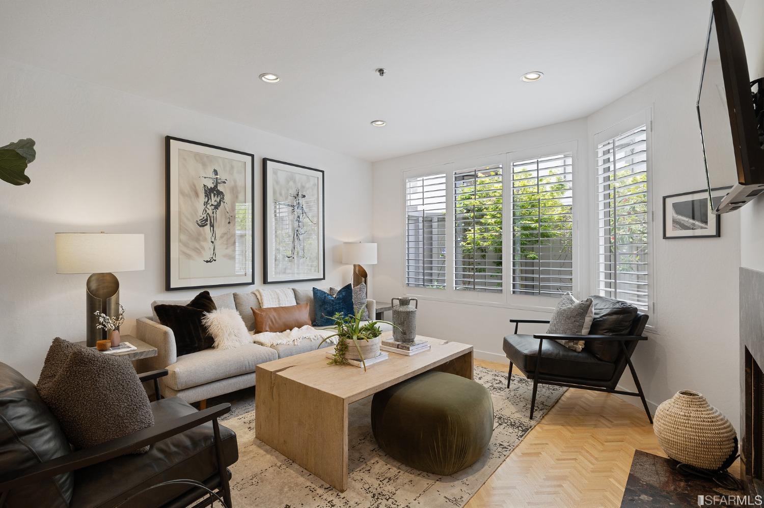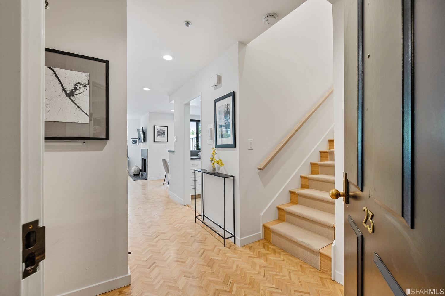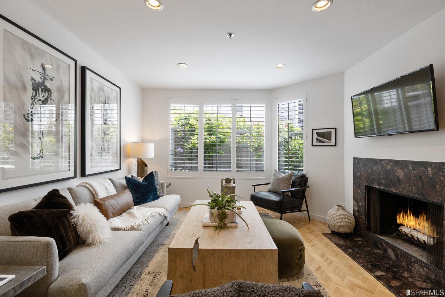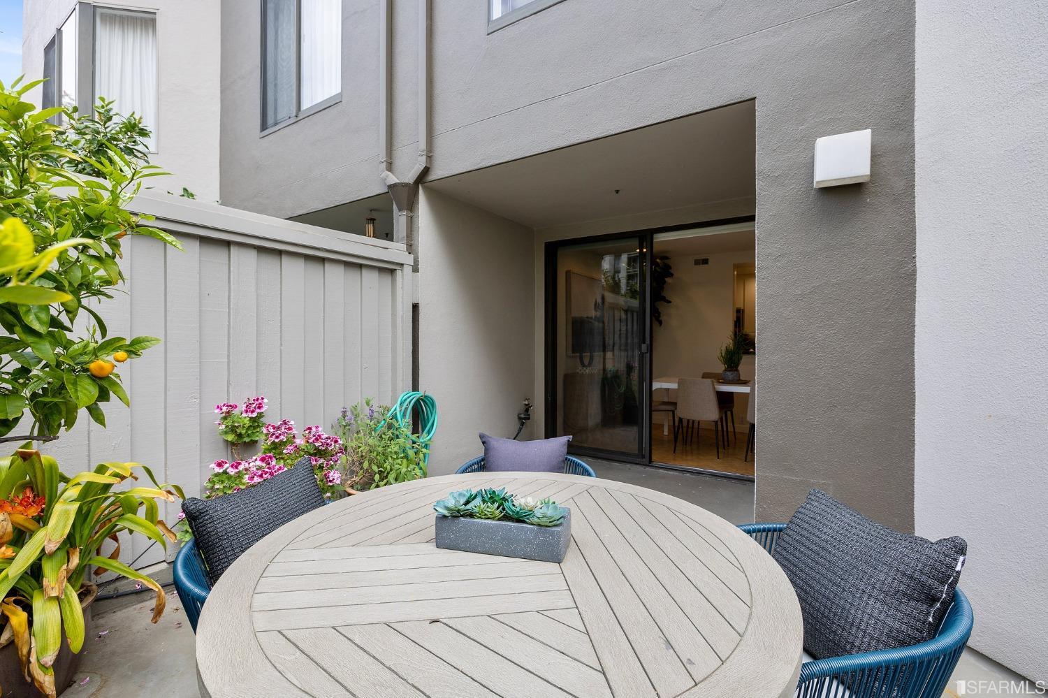 Make this stunning, remodeled residence your own San Francisco retreat. A private 2-level two bedroom, 2.5-bath townhouse with a garden patio facing the courtyard. Beautiful herringbone hardwood floors throughout. The first floor consists of the living room with wall-to-wall windows, a cozy wood-burning fireplace, and a gracious dining room opening to the large patio-perfect for dining al fresco & the urban gardener. A powder room with a laundry closet completes this level. Upstairs is the large primary suite with double closets, a bathroom with shower & tub, a second bedroom, a hall bath, and oversized storage closets. There is a second entrance on this floor. There is one car garage parking & additional storage. Telegraph Landing has a lovely staff, including a 24-hour security doorman/guard, an excellent on-site manager, and an assistant. Amenities include a gym, club room, and two common area roof decks with Bay and Golden Gate Bridge views & communal gardens. Enjoy this outstanding location. Walk to The Embarcadero, Ferry Building, Bay Club, the Battery, the acclaimed Farmers Market, Exploratorium, Levi Plaza, Bay Club & many outstanding neighborhood restaurants. One of San Francisco's most sought-after neighborhoods.